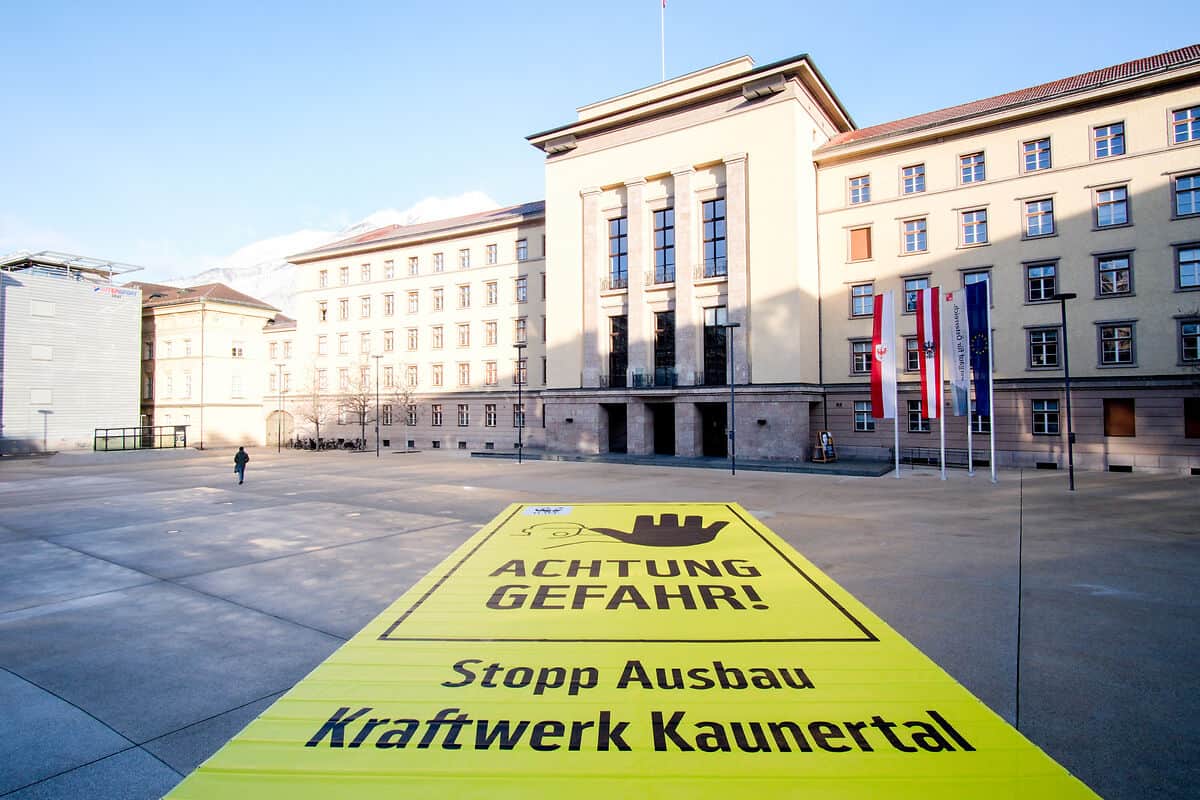 Unter dem Motto „Achtung Gefahr“ hat der WWF am Mittwoch mit einem rund 20 Meter langen Banner am Landhausplatz gegen den Ausbau des Kraftwerks Kaunertal protestiert. Aufgrund grober Sicherheitsmängel appelliert die Naturschutzorganisation an den Landeshauptmann und Tiwag-Eigentümervertreter Anton Mattle, die Stopptaste für das teure Prestigeprojekt zu drücken. „Sicherheit geht vor Profit. Solange zentrale Sicherheitsfragen im Zusammenhang mit Naturgefahren ignoriert oder nur unzureichend behandelt werden, muss Mattle den Ausbau sofort stoppen„, sagt Kampagnensprecherin Marlis Knapp vom WWF. Insbesondere im Bereich Geologie, Permafrost und Gletscherrückgang bestehen erhebliche Lücken und eine große Intransparenz des Konzerns.
