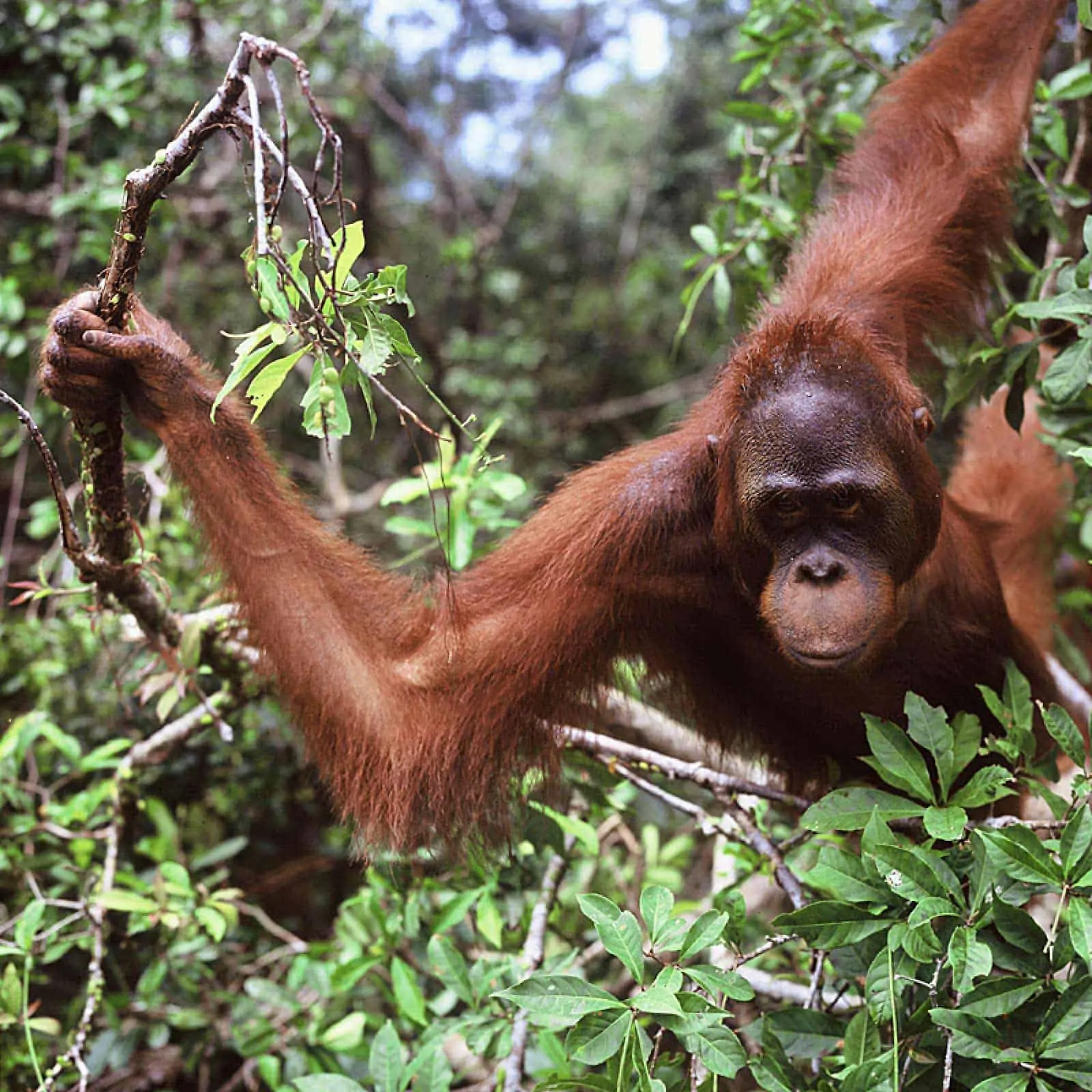 Übersetzt bedeutet sein Name „Waldmensch“ – man könnte ihn aber auch „Regenwaldgärtner“ nennen. Wenn sich die großen Kletterer durch die Baumkronen fortbewegen, brechen sie morsche und alte Äste ab und lassen mehr Licht durch die Baumkronen.