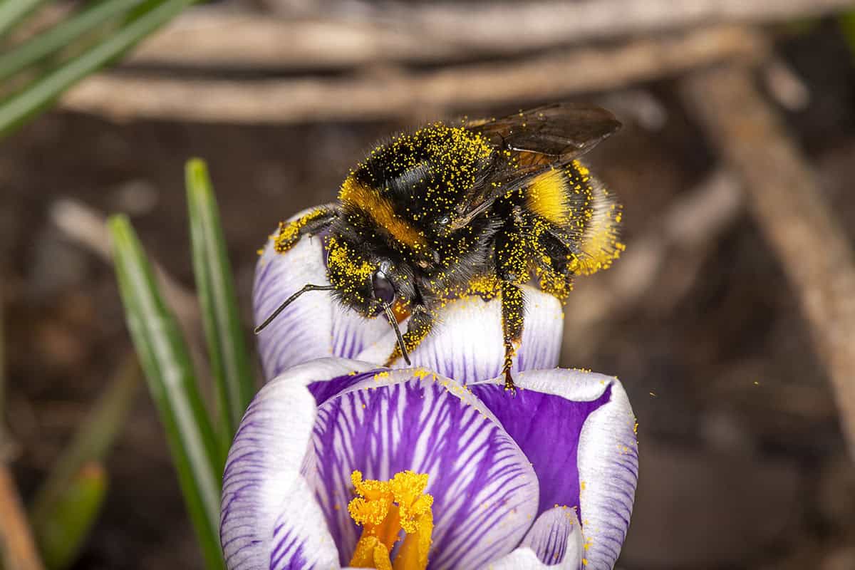 Krokusse sind echte Frühlingsboten. Es gibt sie in violett, gelb und weiß, manchmal auch in blau oder rosa. Auch sie blühen ab Februar oder März auf Wiesen oder in den Bergen und dienen Bienen und Hummeln als erste Nahrungsquelle.