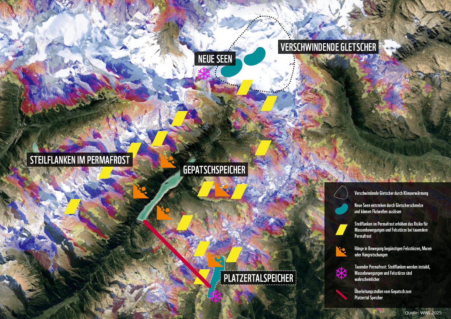Durch das Auftauen der Permafrostböden werden die Berge zunehmend instabil. Das Risiko großer Felsstürze hat sich dadurch in den letzten Jahren verfünffacht. In Kombination mit neu entstehenden Seen könnten herabstürzende Gesteinsmassen sogar Flutwellen auslösen. Die gefährliche Konstellation zeigt, dass die klimagesteuerte Entwicklung in den kommenden Jahrzehnten im Einzugsgebiet der bestehenden und geplanten Speicher des Kaunertals und Platzertals sorgfältig analysiert werden muss.