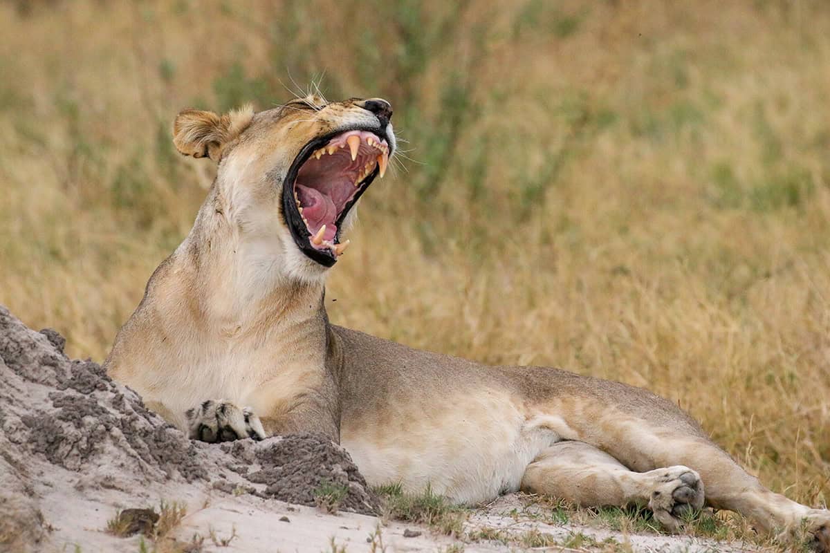 Der Löwe kann ganz schön laut brüllen: bis zu 114 Dezibel. Das ist so laut wie ein Presslufthammer auf einer Baustelle. Damit sein Hals dabei nicht weh tut, haben seine Stimmbänder eine besondere Form und sind sehr dehnbar.