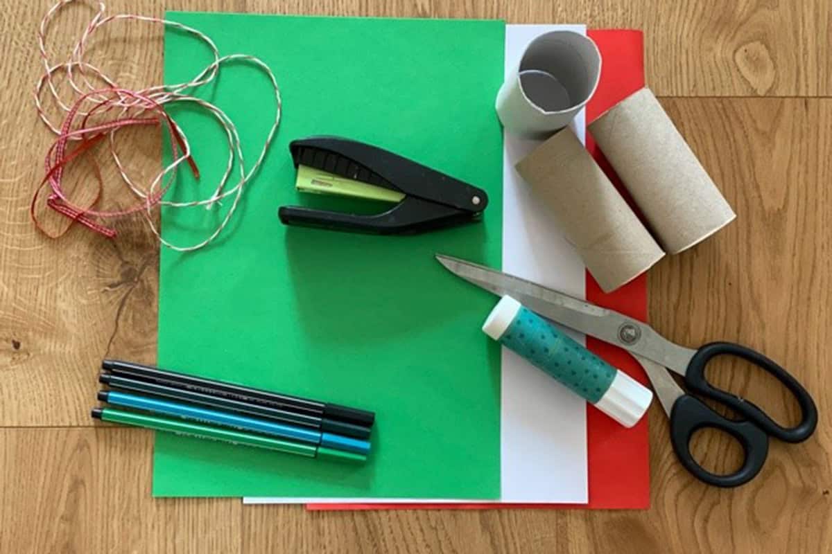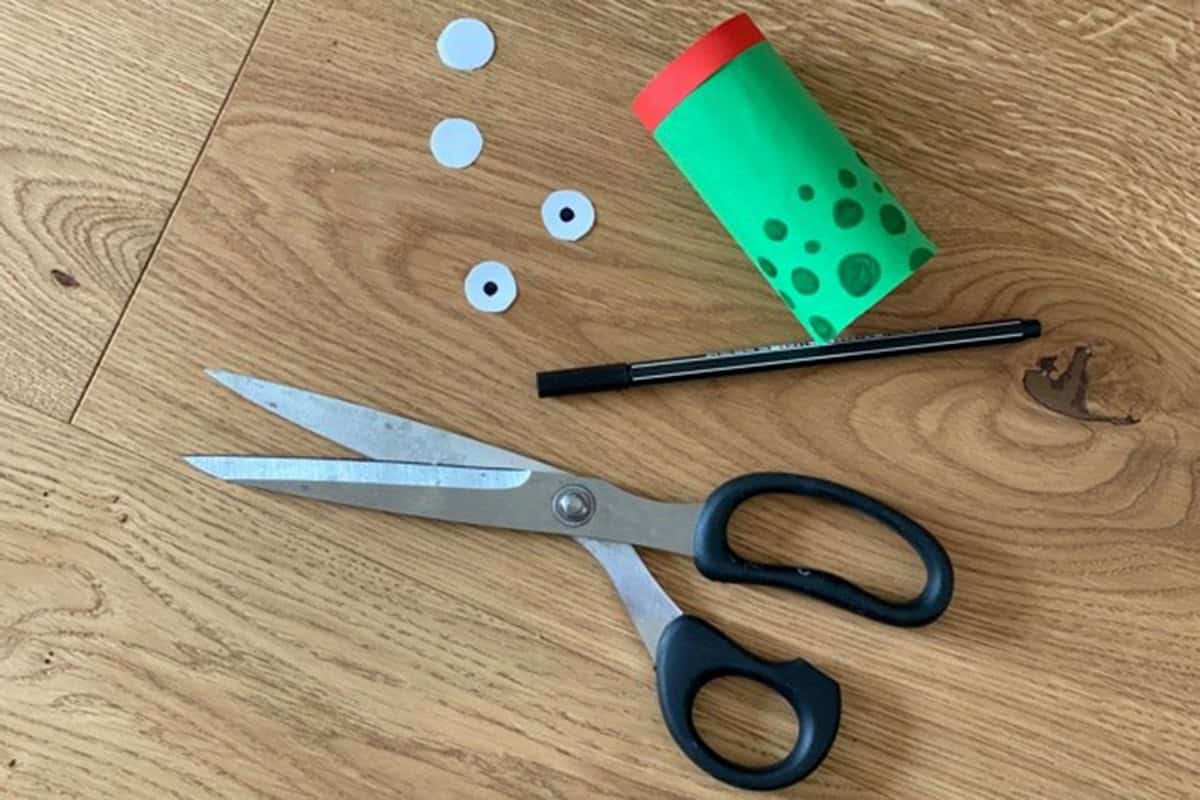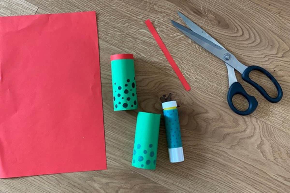 Schneide einen schmalen roten Papierstreifen ab und klebe ihn am vorderen Ende der Klopapierrolle auf. Das ist das Maul.