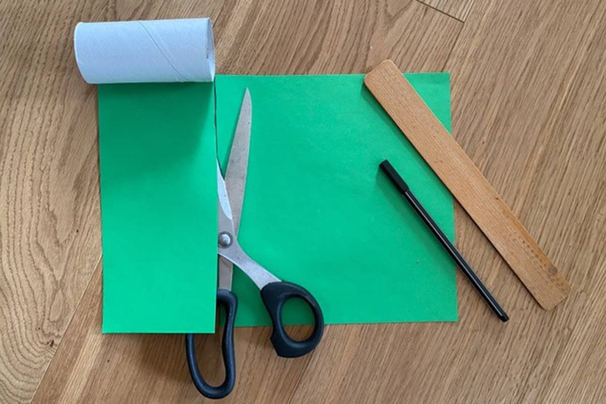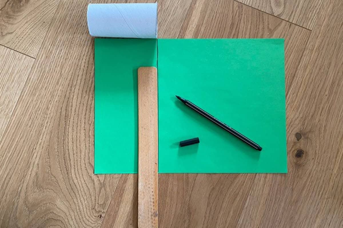 Zeichne auf grünem Papier mit dem Lineal eine Hilfslinie, die so lang ist wie deine Klopapierrolle. Mit diesem Streifen beklebst du später deine Klopapierrolle.