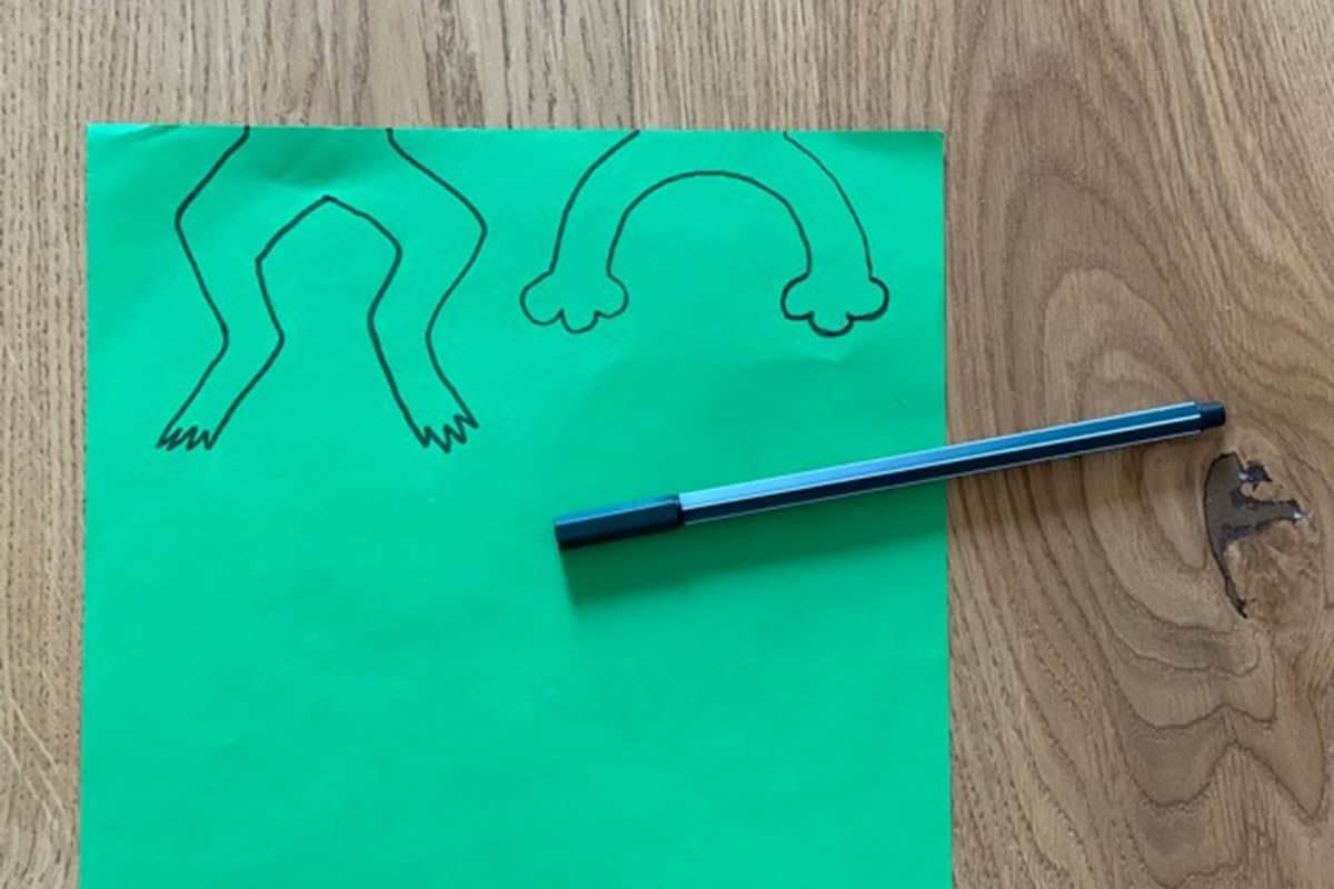 Male Froschschenkel und Arme nach diesem Muster auf grünes Papier und schneide sie aus. Achte darauf, dass beides ein bisschen breiter als eine Klopapierrolle ist.