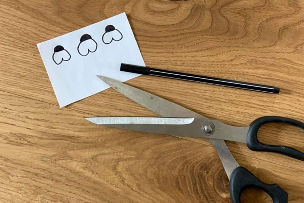 Male nun kleine Fliegen wie in der Vorlage auf das weiße Papier und schneide sie aus.
