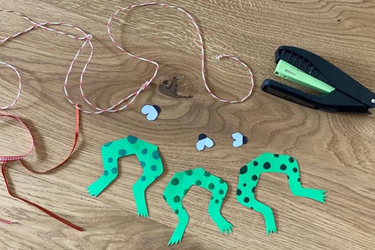 Ziehe die Schnur von hinten nach vorne durch den Froschkörper drücke die Rolle am hinteren Ende flach. So kannst du die Beine gut mit dem Hefter fixieren.