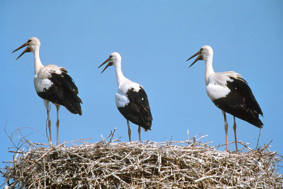 Im Frühjahr zieht der Weißstorch von Afrika nach Europa, um dort Babys zu bekommen. Storchenmännchen und Storchenweibchen leben getrennt. Wenn sie brüten wollen, kommen sie zusammen. Zuerst sucht das Männchen einen guten Platz für das Nest. Das Storchennest hat auch den lustigen Namen „Horst“. Das Weibchen wählt den Partner mit dem schönsten Nest! Hat sich ein Paar gefunden, trifft es sich oft jahrzehntelang immer wieder in demselben Nest. Nach der Paarung legt die Storchenmutter drei bis fünf Eier. Weibchen und Männchen brüten die Eier abwechselnd aus. Nach 32 bis 34 Tagen schlüpfen die kleinen Störche! Die Eltern kümmern sich gemeinsam um ihre Jungen. Dann bleibt immer ein Elternteil bei den Jungen im Nest, während das andere nach Nahrung sucht.