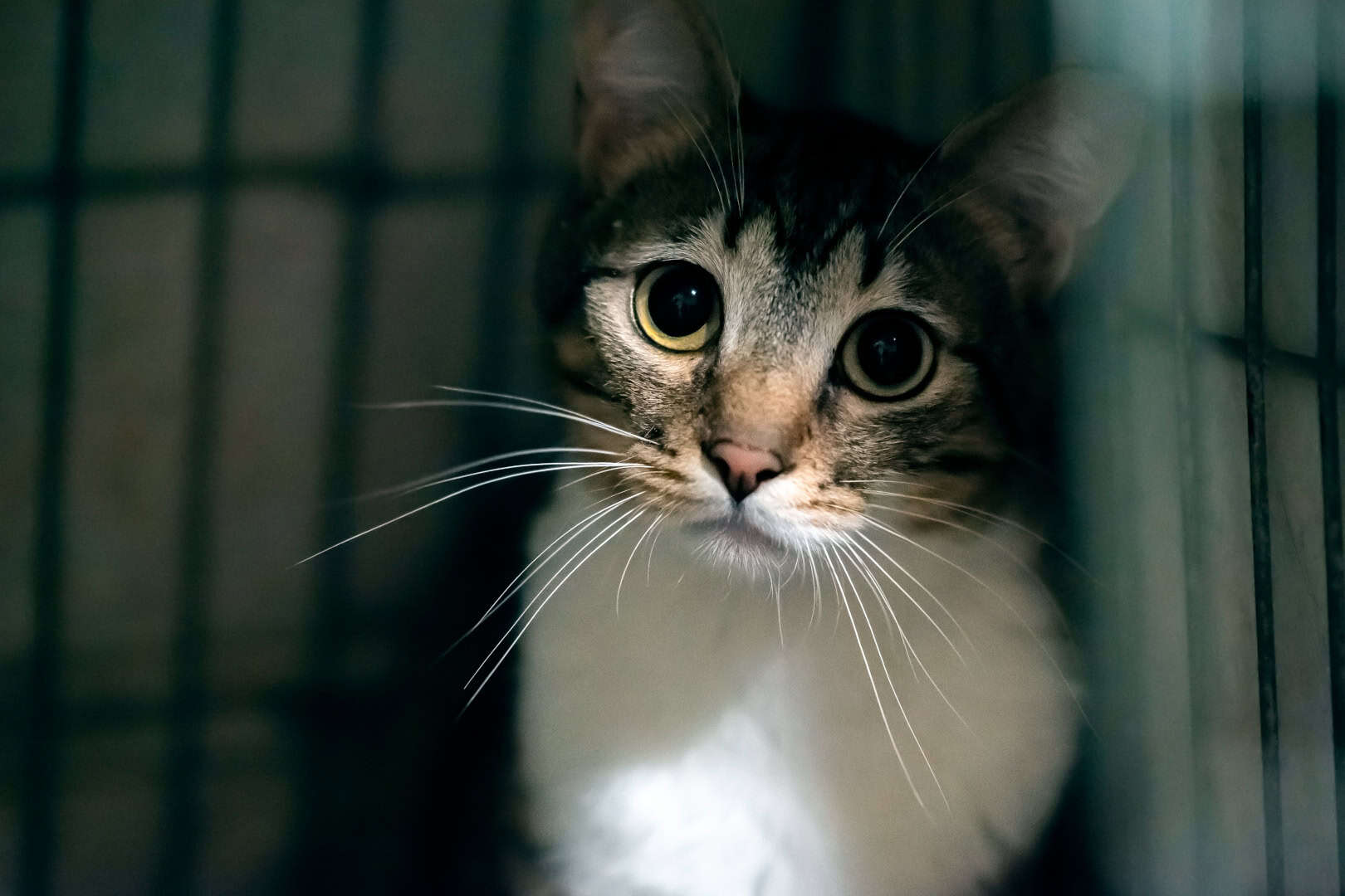 Verängstigte Katze im dunklen Umfeld