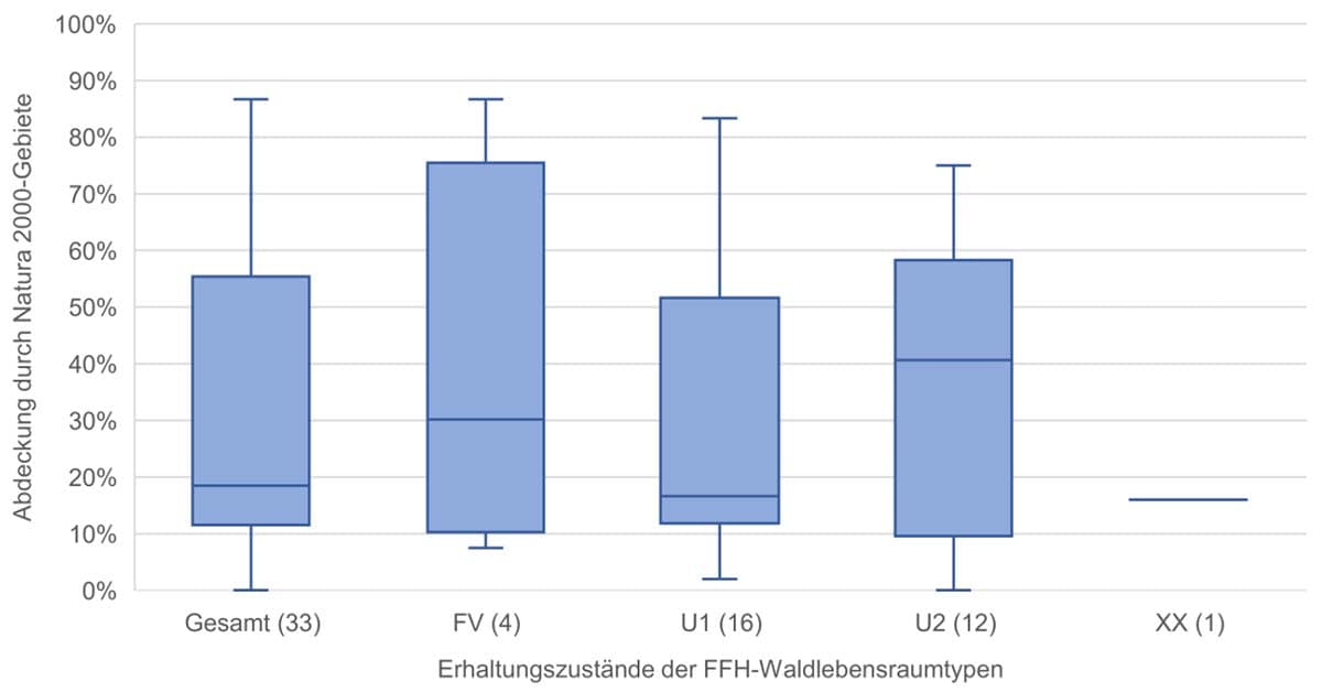 Box Plot der Abdeckung der FFH-Waldlebensraumtypen nach Erhaltungszuständen durch Natura 2000-Schutzgebiete in Prozent (Quelle: EEA, 2020).