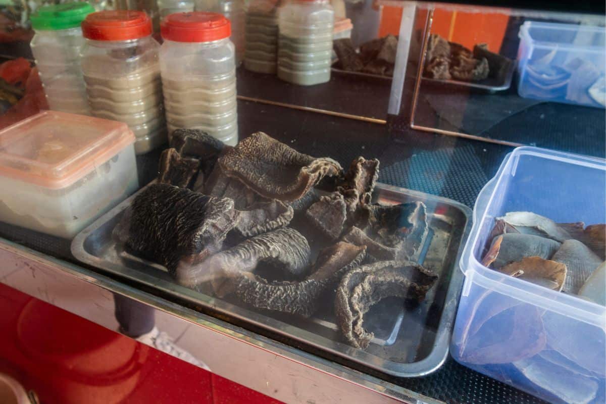 Getrocknete Elefantenhaut wird in einem Geschäft in Mong La, Sonderverwaltungszone, Myanmar, neben Schuppentierschuppen zum Verkauf...