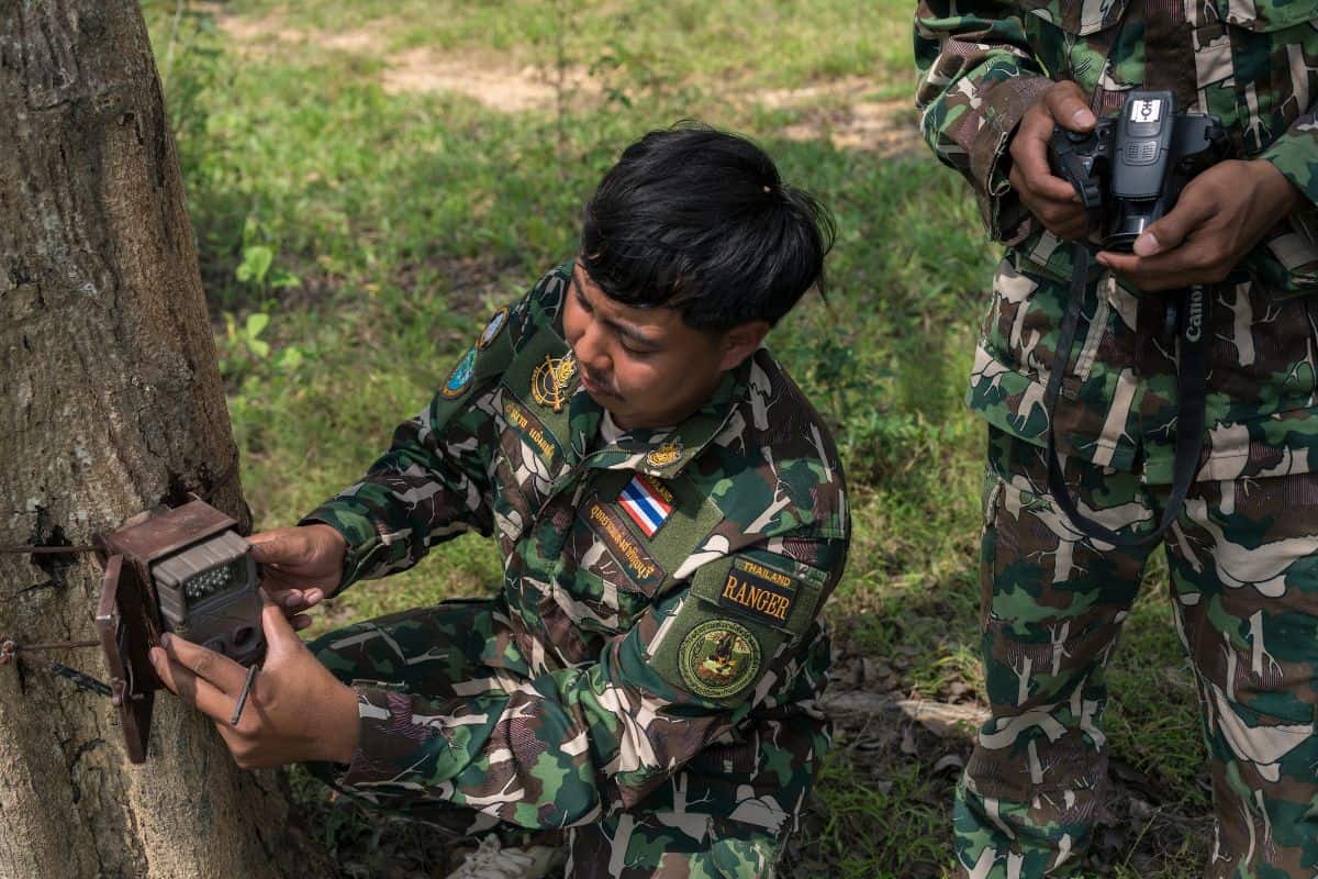 Ein Ranger öffnet eine Fotofalle, die in der Nähe eines künstlichen Teiches im Kui Buri Nationalpark, Provinz Prachuap Khiri Khan, Thailand, aufgestellt...