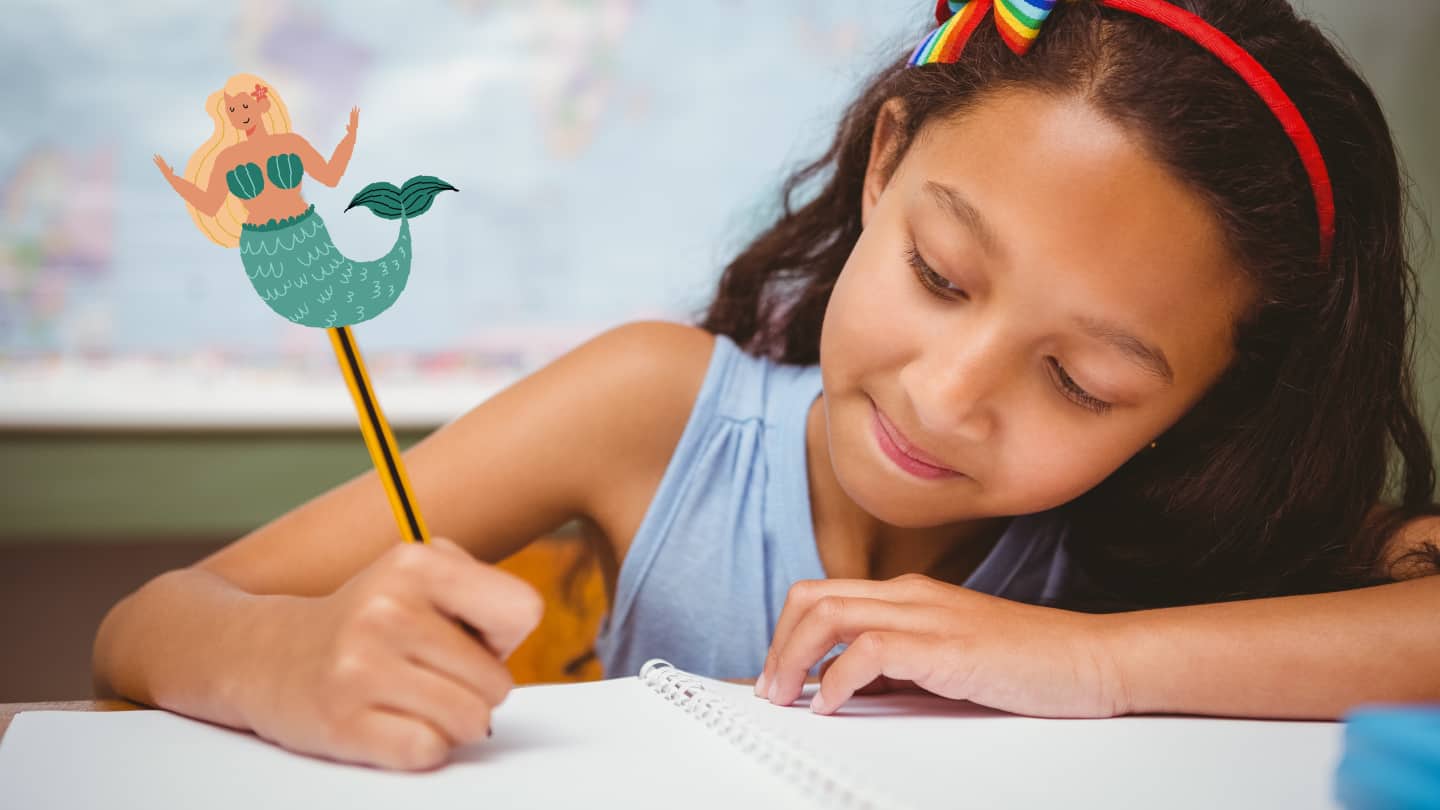Ein Mädchen löst ein Kreuzworträtsel zum Meer