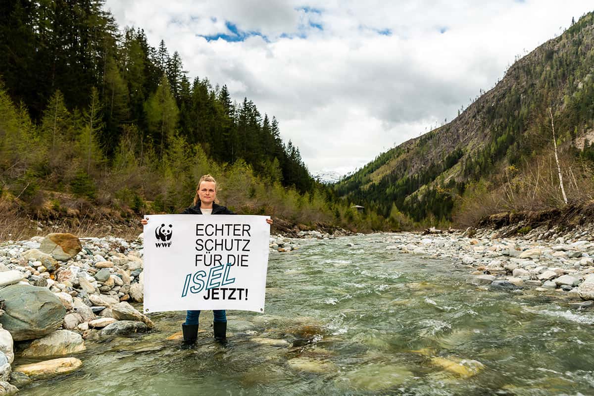 WWF-Expertin-Marianne-Götsch-mit-Transparent-am-Kalserbach(c)Sebastian-Frölich